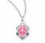 Blessed Mother Mary with rays coming out of her extended hands, crushing a serpent under her feet. Pink enameled Oval shaped double sided pendant . Solid .925 sterling silver. Medal is die struck. Hand polished and engraved by New England Silversmiths. Dimensions: 0.6" x 0.4" (14mm x 9mm) Weight of medal: 0.7 Grams. 18" Genuine rhodium plated curb chain. Made in USA. Deluxe velvet gift box.